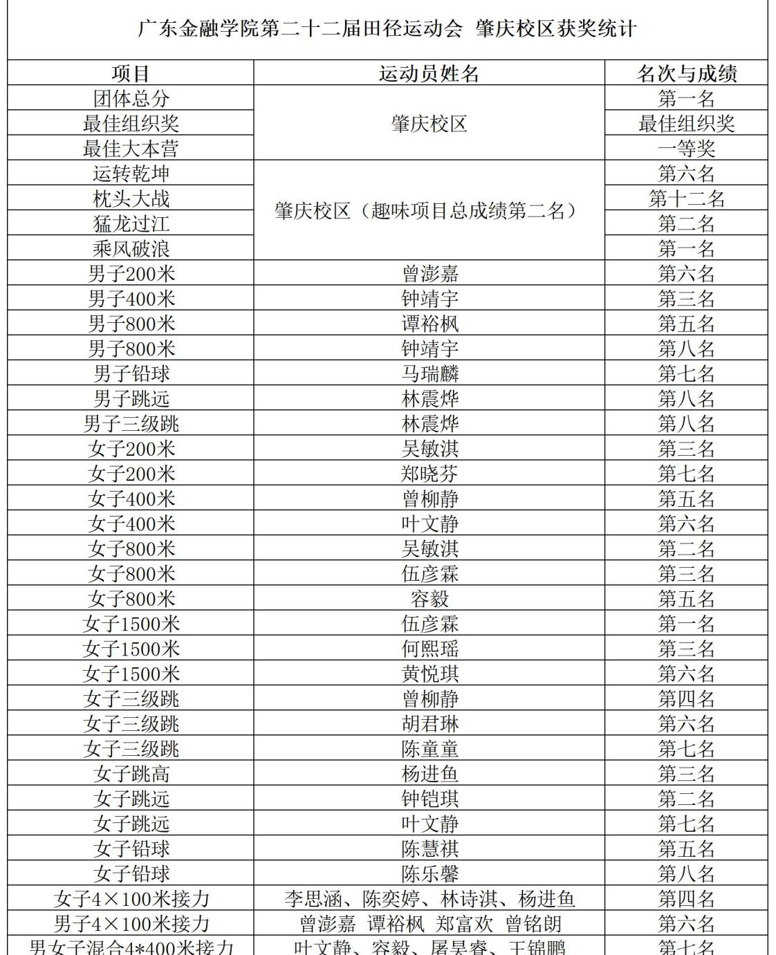 2025年11月28日,广东金融学院第二十二届田径运动会在我校清远校区隆重举行。肇庆校区代表队凭借出色的发挥,一举夺得团体总分第一名、最佳组织奖和最佳大本营一等奖三项荣誉。优异成绩的取得,离不开校区全体师生的团结协作以及校区健儿们的奋勇拼搏,充分展现了校区团结奋进、勇毅前行的精神风貌。