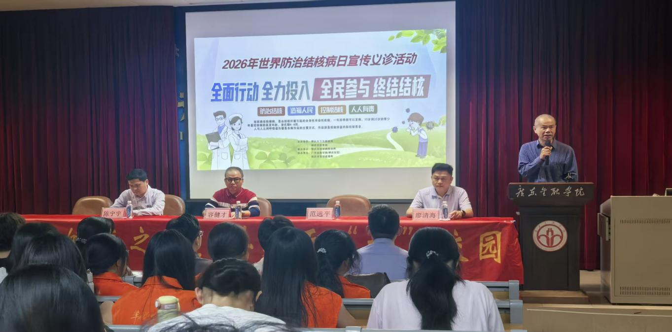 3月20日下午,在第31个“世界防治结核病日”到来之际,肇庆校区围绕“全面行动 全力投入 全民参与 终结结核”的主题,成功举办结核病防治科普讲座暨义诊活动。本次活动旨在深入贯彻落实党的二十届四中全会精神和推进健康中国建设的总体要求,通过专业科普与健康服务相结合的方式,切实提升师生对结核病的认知水平和自我防护能力。